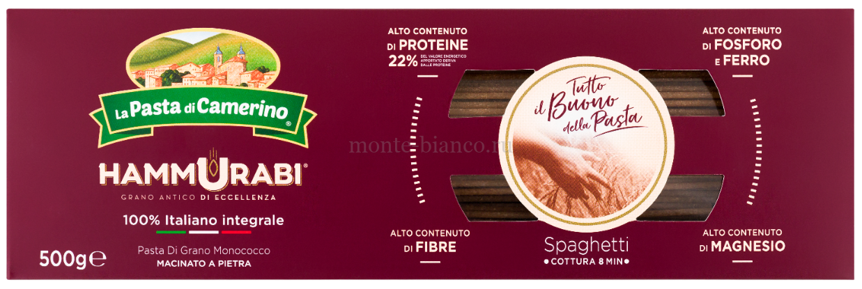Спагетти изготовлены из цельнозерновой муки из твердых сортов пшеницы (однозернянка сорт Hammurabi), с высоким содержанием белков, пищевых волокон, фосфора, железа и магния, которые сохраняются в готовом продукте благодаря сушке при низкой температуре в течение 22 часов. Паста HAMMURABI— это тысячелетнее совершенство, созданное с помощью уникального процесса, который усиливает естественные характеристики пшеницы: в дополнение к высокому содержанию белка (22%) и высокому содержанию волокон и питательных веществ, сорт пшеницы однозернянки Хаммураби имеет низкий гликемический индекс, меньше чем 15%, что делает пасту легкоусвояемой, идеальной для спортсменов и для всех тех, кто стремится к хорошему самочувствию в любом возрасте.