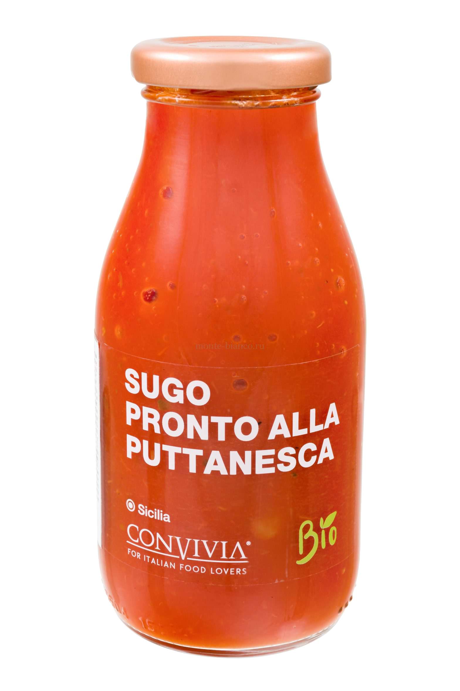 Соус томатный Путтанеска - традиционный итальянский томатный соус с оливками и каперсами. Является продуктом органического производства, произведен из томатов черри, выращенных под жарким солнцем Сицилии. Продукт бeз глютeна, с низким содeржаниeм бeлка. При производстве не добавляется сахар, не используются консерванты и красители.
