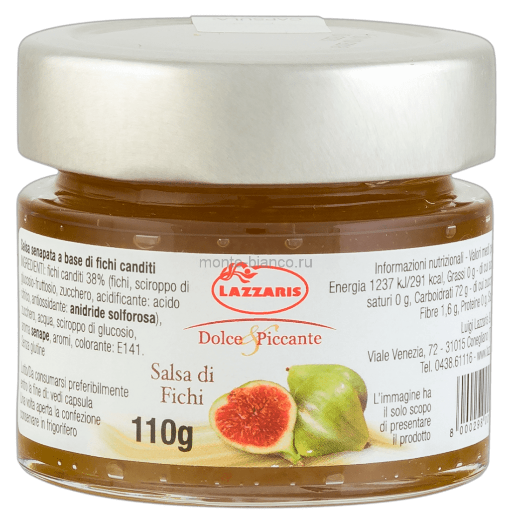 Соус идеальной консистенции с характерным сладко-пикантным вкусом, полученный посредством сбалансированного соединения инжира и горчицы. Оригинальный соус приготовлен из нежного инжира, поспевшего под ласковыми лучами итальянского солнца. Соус хорошо сочетается с дичью, свининой, острой горгонзолой и рокфором. Этот фруктовый соус как нельзя лучше оттенит сливочную нежность деликатесной фуа-гра!