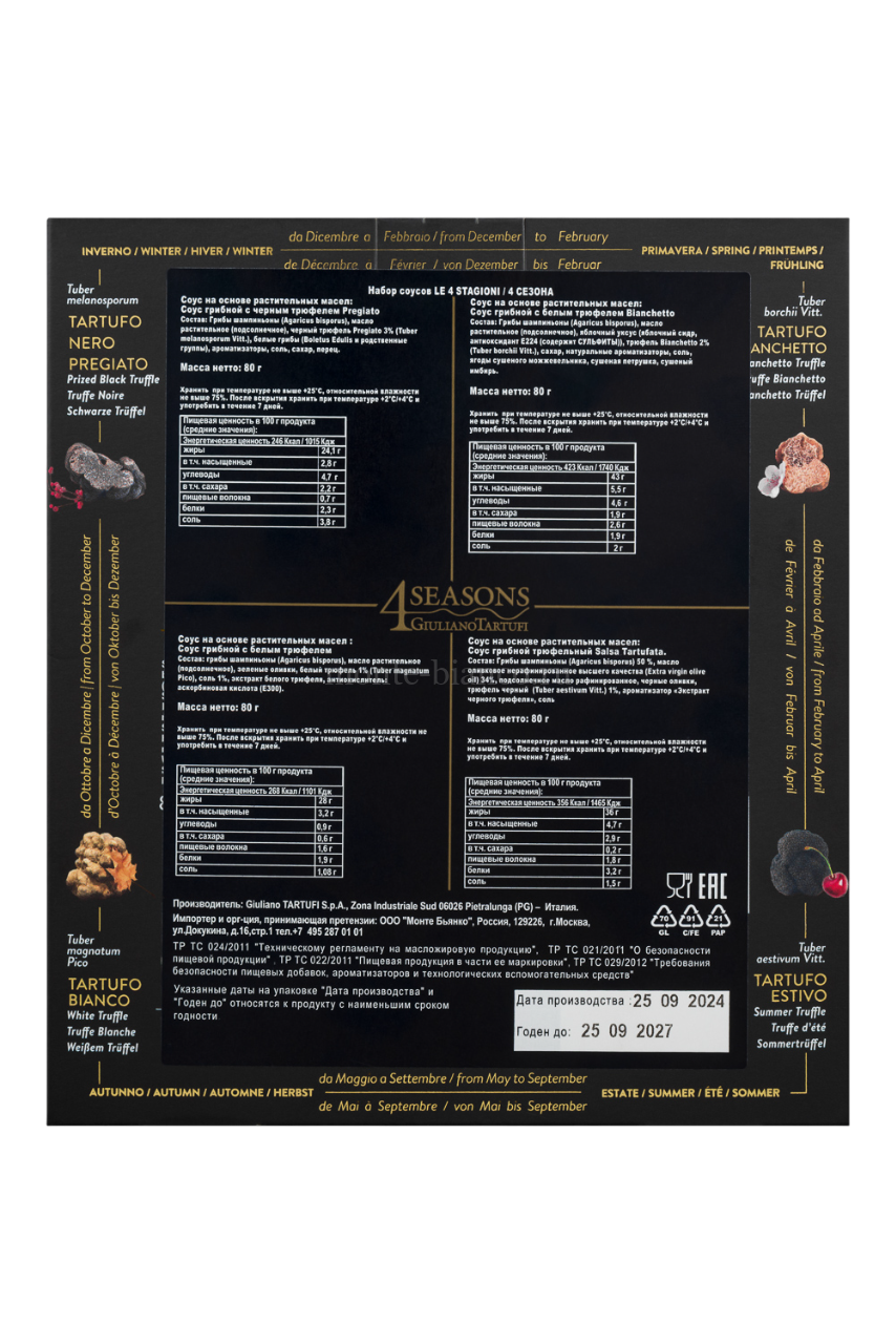 | Наименование | Набор Giuliano Tartufi LE 4 STAGIONI / 4 СЕЗОНА: 4 соуса, подарочная упаковка, Италия |